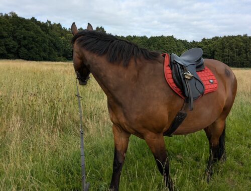 ..følte lidt der var et tidspunkt hvor han måske skulle hoste, men så skridtede han og ja der kom kun prust..Havde den vildeste oplevelse da han var varm.. han bliver ivrig og går max samlet piaffagtigt.. jeg tænker at jeg måske presser ham for meget og at han bare skal have lov at trave ud, men får så kigget på hans ører der ser så fine glade ud.. og noget lidt andet.. det føles som om det er ham selv der byder ind, at det er ham der tilbyder at gå ind og gå helt samlet og ikke som sådan noget jeg tvinger igennem selvom jeg klart forsøger at understøtte hans forsøg.. bagefter er han helt vildt tændt og racer af sted og jeg tænker at her ville det være virkelig fedt hvis jeg havde styr på den halve parade.. når han bliver kåd er han altså ret ligeglad med den.. men jeg huskede at tænke vejrtrækning og ro på og så lidt i hånden så muligt.. tænkte virkelig meget at jeg ikke måtte krølle ham sammen.. være så blød som muligt og samtidig ville jeg også gerne kunne både styre og følge med både i krop og sind samtidig med jeg også ville med-nyde at han havde det så godt at han opførte sig sådan!