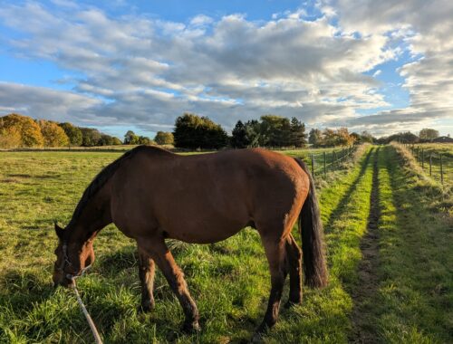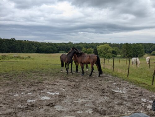 Lod Magic og Mulligan ride fra os ved p pladsen .. fortrød det helt tosset.. så synd for bamsen.. han vrinskede og bukkede fra skridt og løse tøjler.. er sikker på han følte sig efterladt og at han ikke havde gjort sit job godt nok fordi de var blevet væk.. men han var altså også mega sej og vi klarede den helt hjem uden jeg hoppede af.. talte til ham næsten konstant hele vejen og fortalte ham alt var okay og vi ville se dem igen derhjemme…de nåede os før vi var helt oppe på gården.. på det tidspunkt stod vi mellem foldene og græssede og Humle stod og sov ved siden af inde på folden..