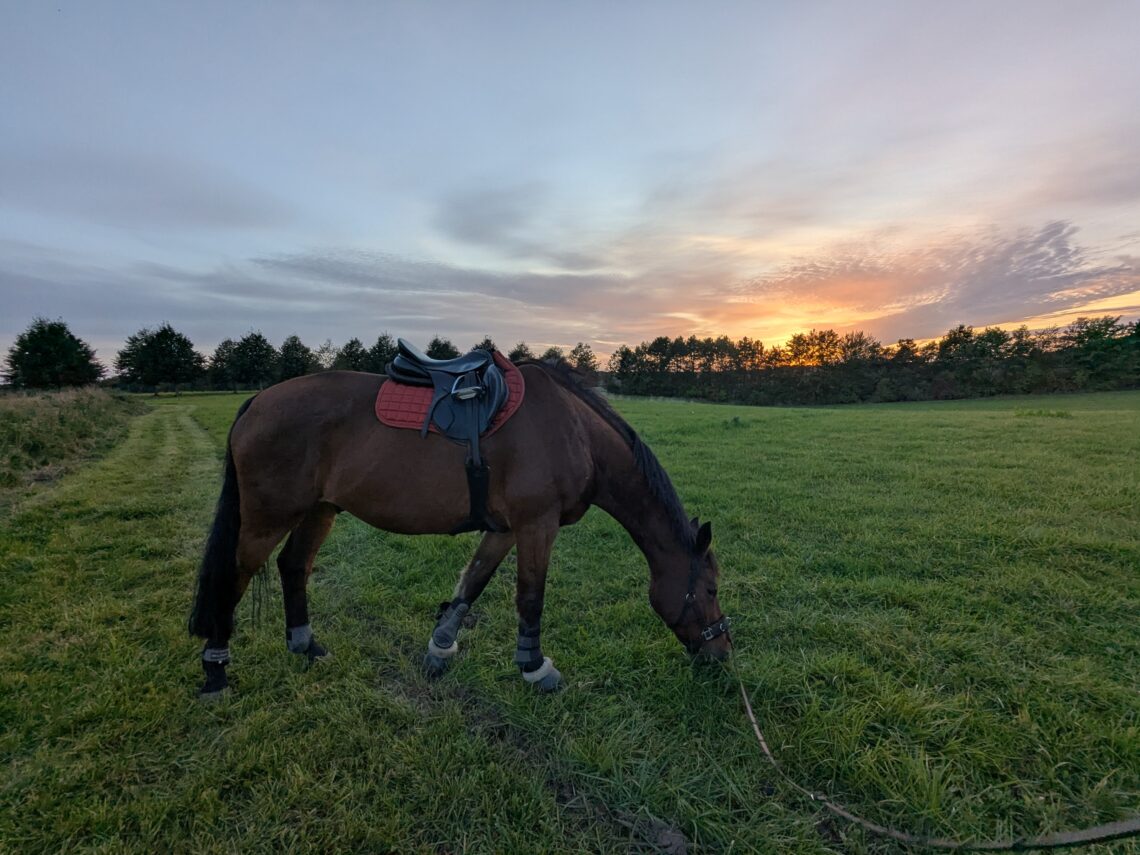 ..på et lidt mærkeligt tidspunkt.. græssede ved bakkerne mens jeg talte med Alberte der gerne ville med Leo til Helsinge til aften.. da jeg var færdig med det ville jeg gå videre men Lido ville græsse så det diskuterede vi lidt.. og pludselig hostede han meget.. nog kun tre dybe host men det føltes som om noget sad fast eller generede.. På banen i trav kunne jeg høre en anden lyde end den der kommer fra traven som måske er lidt der suges op når han er frisk og klar.. den forsvandt heldigvis..Til gengæld var han meget meget obs på noget ude over foldene så red med respekt for det.. havde lagt bommer og lavet lille kryds.. vi hoppede vildt nok alle de tre gange vi red på og hver gang fik ham godbid nede ved kortsiden.. tænker det er en fin måde at lære ham at rosen ligger efter springet så vi kommer mere sikkert over hver gang.. ingen galop men ellers glad.. Stod med magnetdækken efter træning.. Har aftalt med dyrlægen at hun kommer 1/10 og tjekker for mine tanker ift Ppid/Cushings..