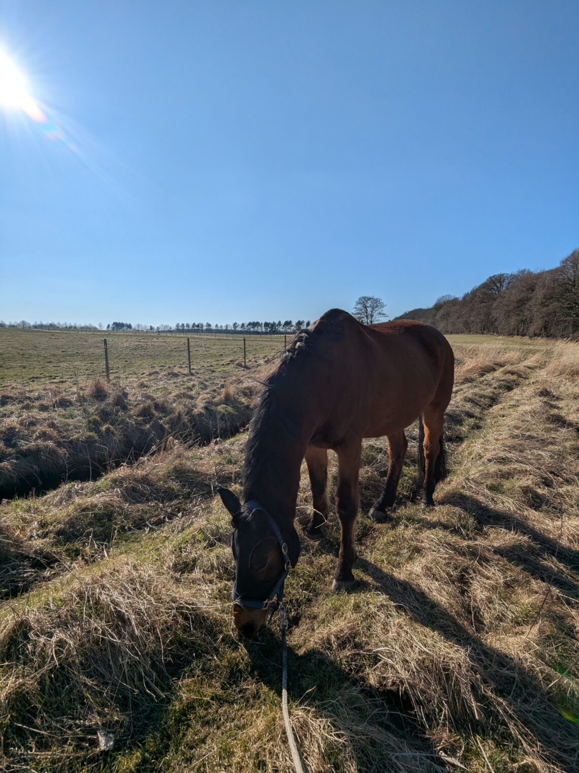 Jeg kørte hjem efter vores chipaflæser og lod Lido stå med sin fir-tech masken og gamacher og uldtæppe imens.. det er vildt nok så meget temperaturen falder om aftenen, så fra at være okay behageligt i solen falder den til under frysepunktet og med rå tåge var det iskoldt..